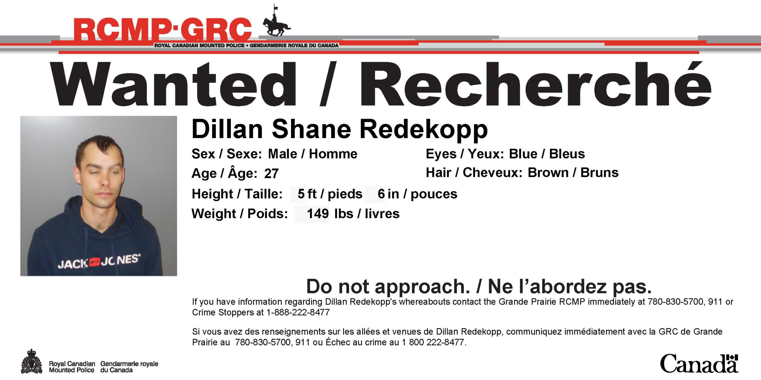 Authorities say Redekopp is also wanted on a Canada-wide warrant out of Kelowna B.C. for Assault and Criminal Harassment. He is described as standing 5’6″ tall, weighing approximately 150 pounds with brown hair, and brown eyes.